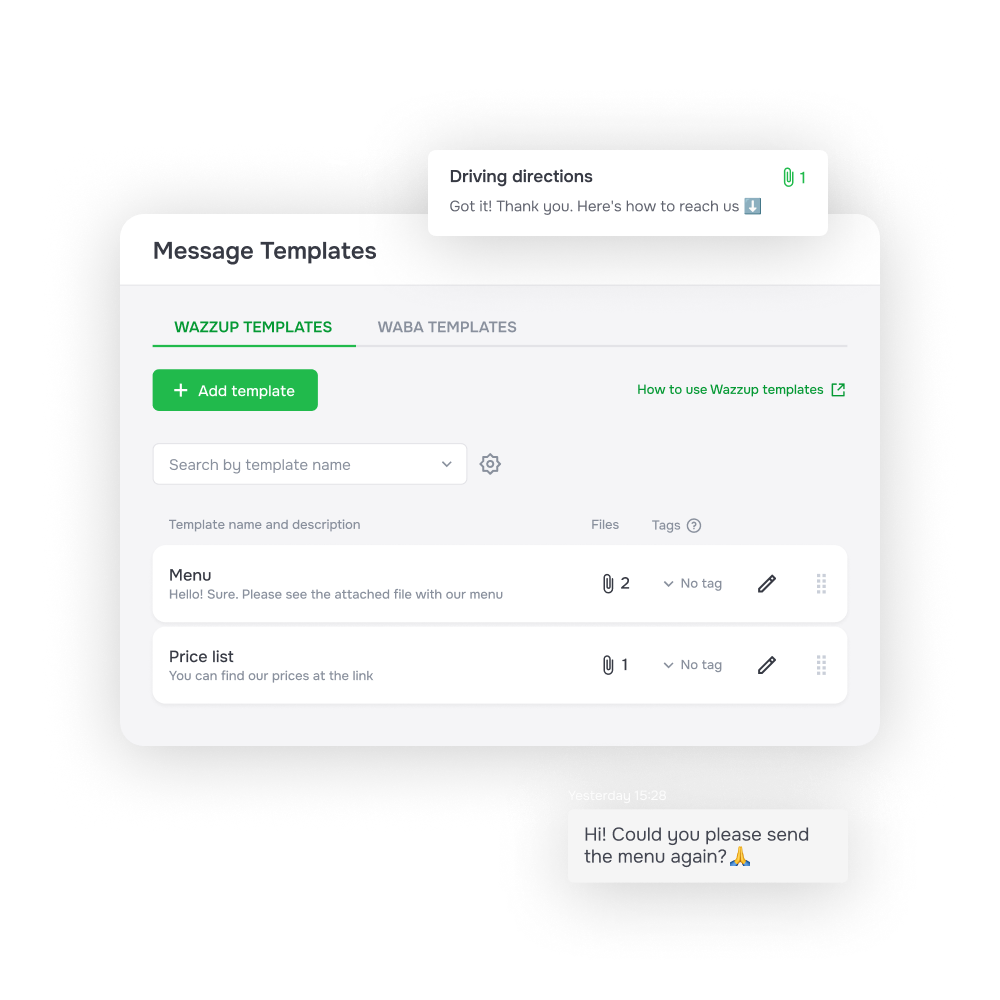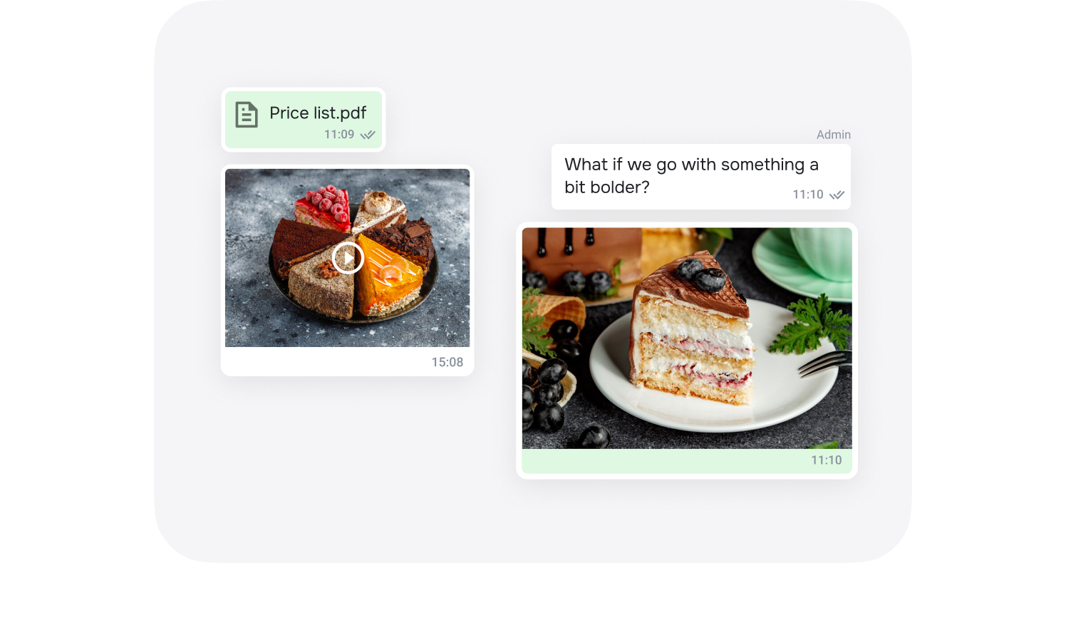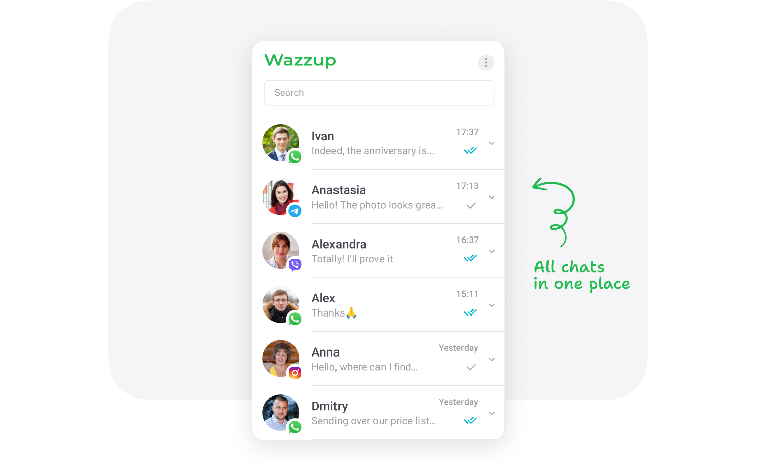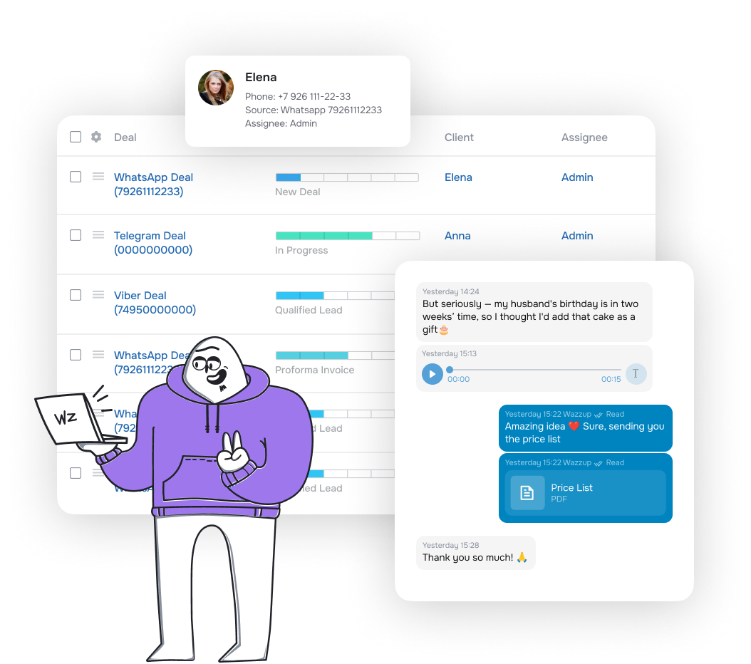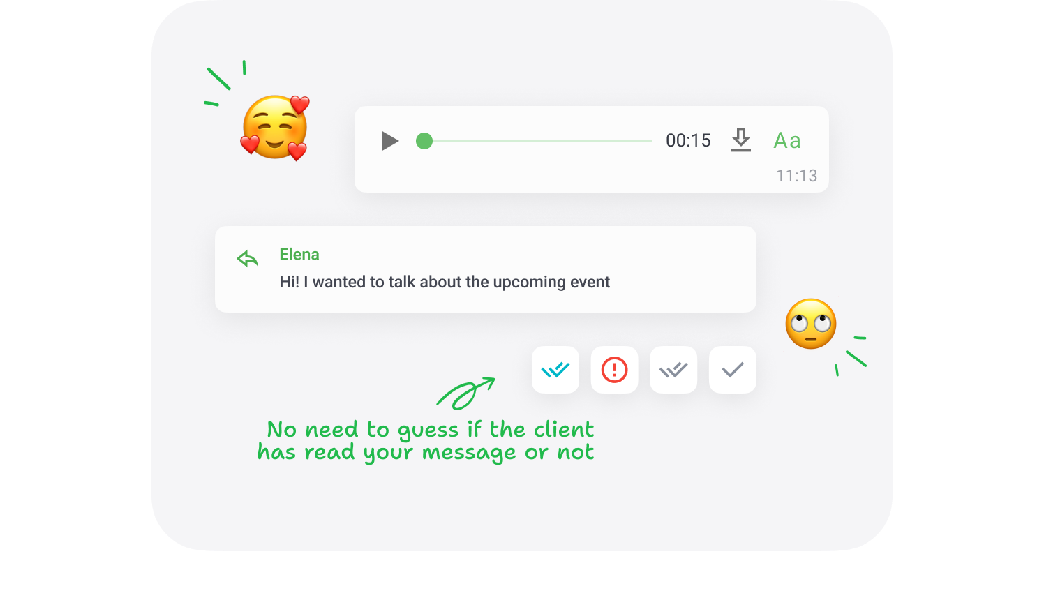 Wazzup keeps all the features you’re used to from WhatsApp, Telegram, and Viber: message statuses, emojis, voice notes, quoting