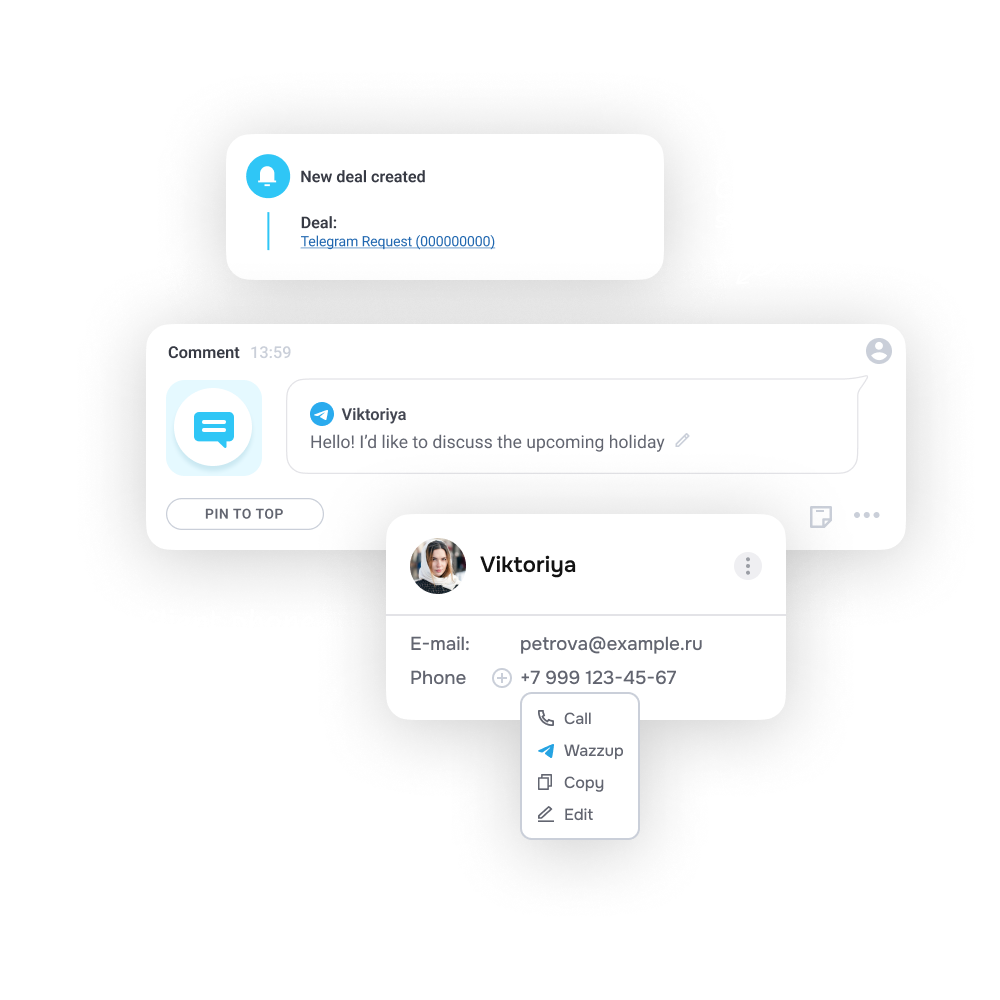 No need to copy phone numbers or look for clients in the CRM. Just click the button and go directly from the chat to the deal