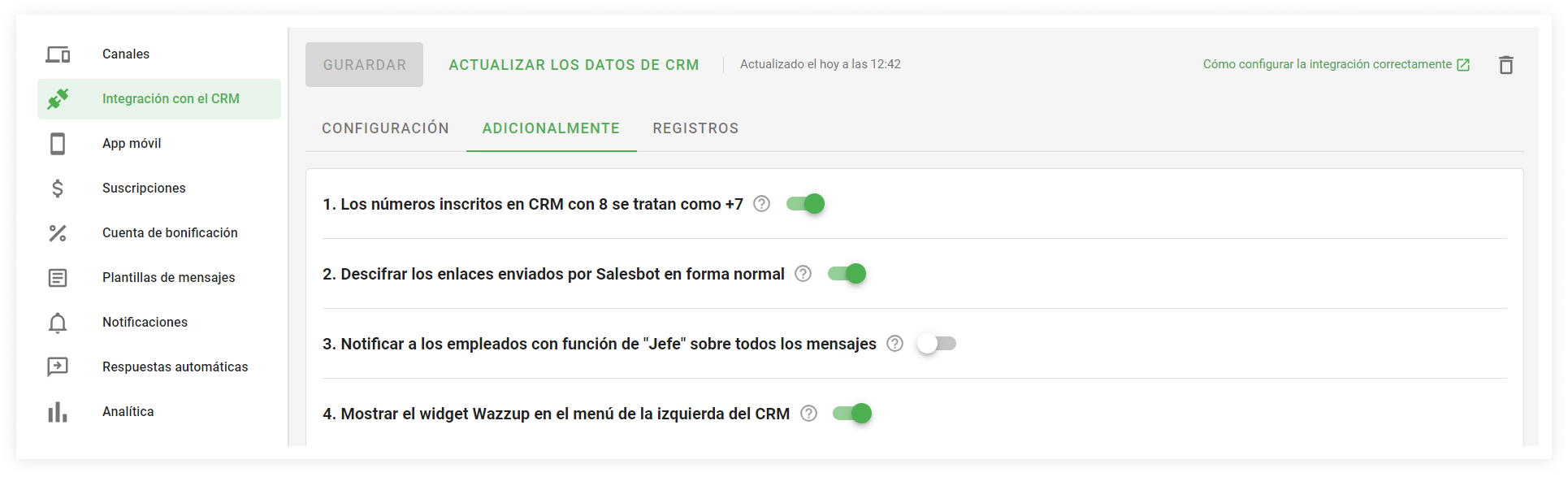 Los ajustes adicionales se encuentran en la pestaña "Integración con CRM" → "Adicionalmente" y se aplican a todos los canales a la vez.