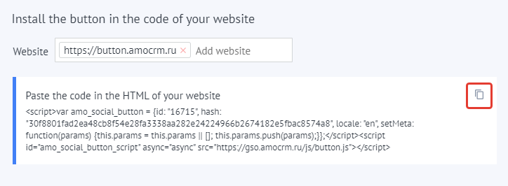 Después de eso, aparecerá el elemento "Botón para el sitio" en el lado izquierdo del panel. Esto significa que el botón está listo para usarse. Para cambiar su configuración o copiar el código de inserción, haz clic en él: