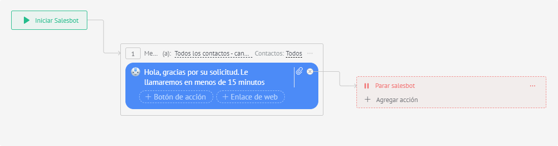 Salesbot es un bot que puede ser programado para completar ciertas acciones. Por ejemplo, si tienes el número de un cliente, pero aún no has mantenido correspondencia con él, puedes utilizar Salesbot para iniciar el diálogo.