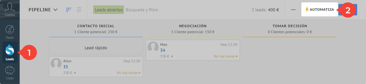 1. Vaya a "Leads" → abra el embudo necesario → haga clic en "Automatiza" en la esquina superior derecha.