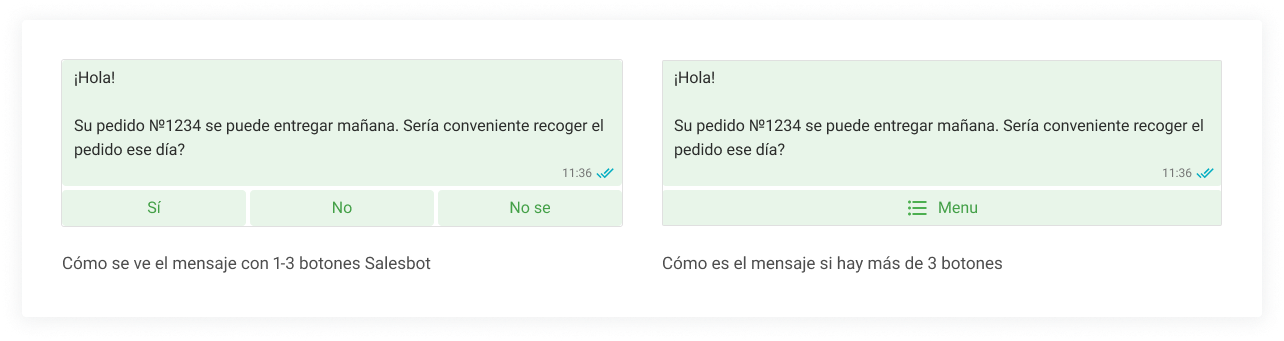 Desde los canales de WhatsApp Business API (WABA) puede enviar mensajes con 1-10 botones de Salesbot Kommo. El mensaje saldrá sólo si hay conversación activa WABA 24 horas.