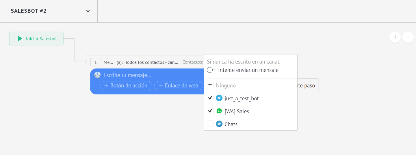 En la configuración del paso "Mensaje", puedes seleccionar un canal desde el que enviar el mensaje. Para ello, haz clic en "Canales" y marca el necesario. Si no, el bot enviará un mensaje desde todos los canales.
