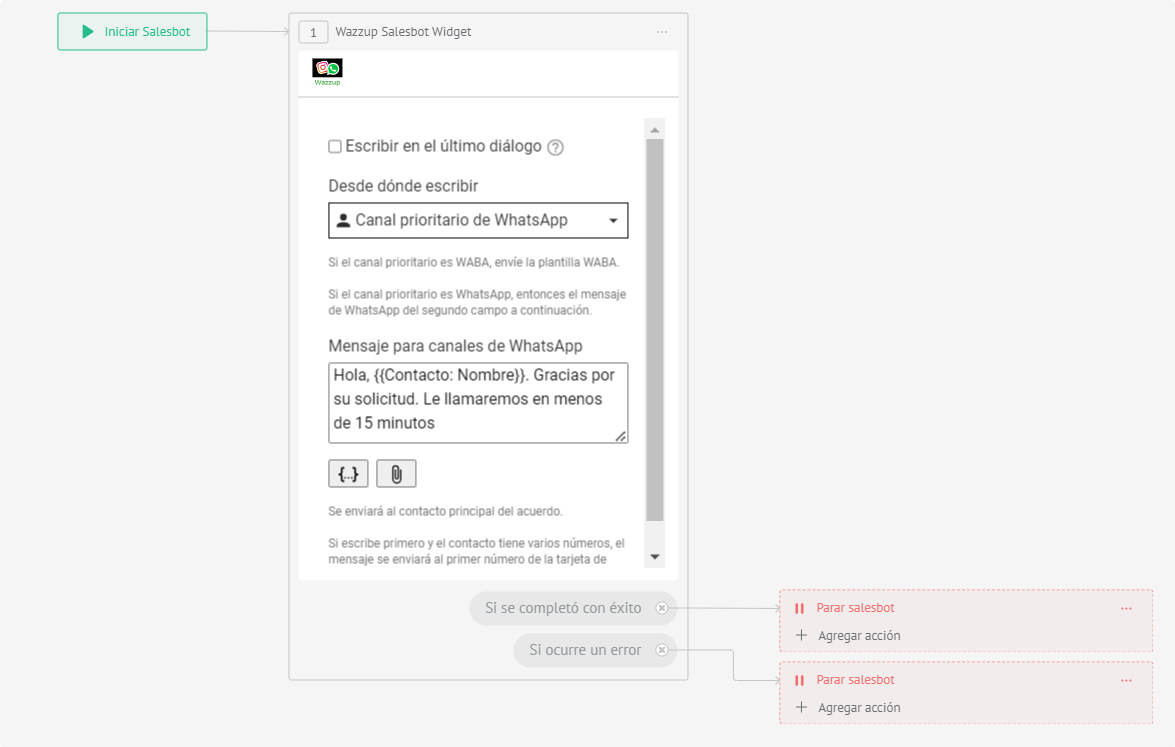 El widget de Wazzup en Salesbot envía un mensaje al número de cliente y mensajero que especifiques en la configuración.