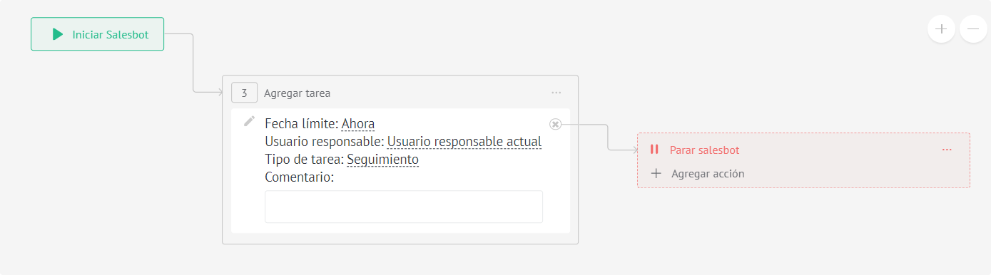 Especifica la acción que debe realizar el bot. En nuestro ejemplo, asignaremos al vendedor la tarea de ponerse en contacto con el cliente. Tras la conversación, decidirá cómo proceder con el cliente potencial.