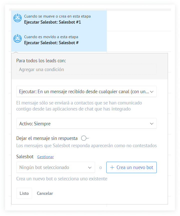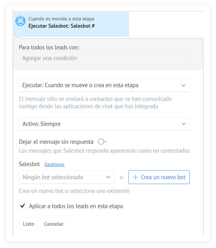 Cuando guardes el bot con el mensaje, volverás a la configuración del embudo.En este paso, nos aseguramos de que tras la respuesta del cliente, el bot realice la acción necesaria. Por ejemplo, mueve el lead a otra etapa o crea una tarea para el gestor.