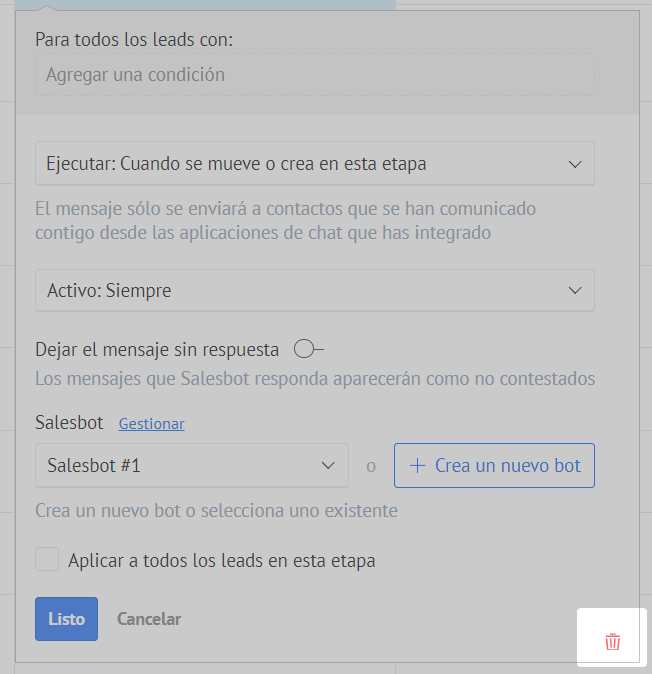 Si quieres que la lista de correo se envíe a todos los clientes que han pasado a la etapa con el bot, puedes dejarlo como está. Tan pronto como el lead esté en la etapa con el bot, un mensaje irá al cliente.
