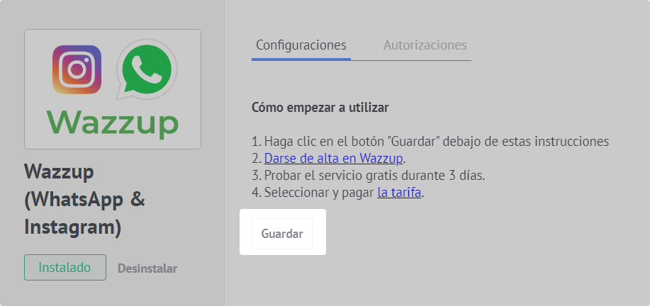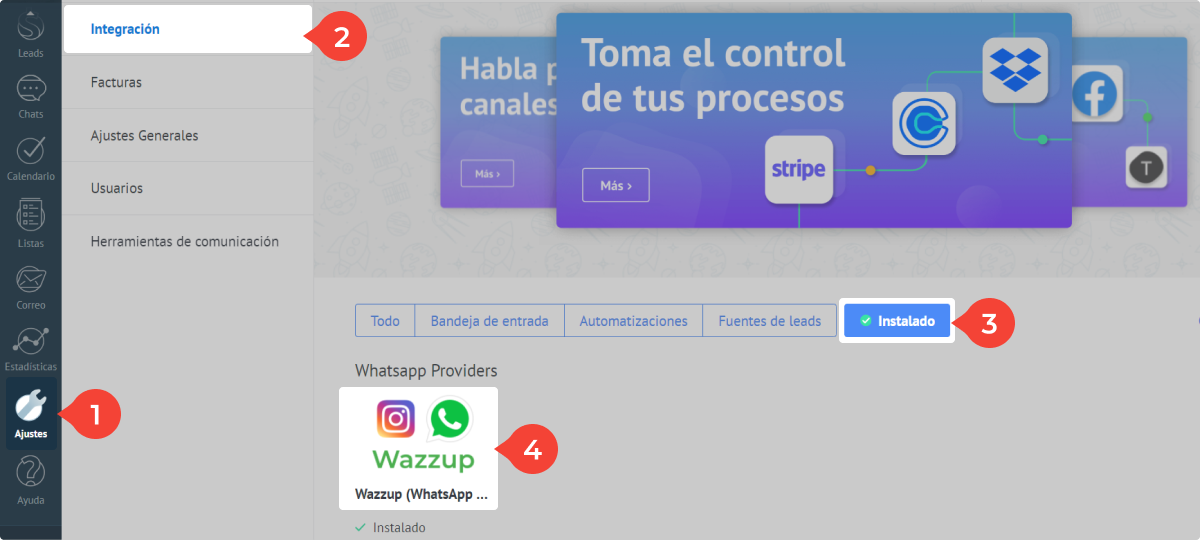 4. Vaya a su cuenta de Kommo. En la barra de menú de la izquierda, seleccione "Adjustes" → Integraciones → vaya a la pestaña "Instalado" → haga clic en el icono de Wazzup.