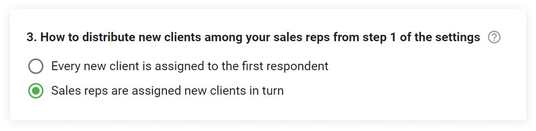 2. Los representantes de ventas se asignan a nuevos clientes por turno — todos los usuarios con el rol de "Representante de ventas" que tienen acceso a los diálogos de Wazzup reciben diálogos de manera equitativa. Cuando un nuevo cliente escribe, solo un gerente verá la notificación y se le asignará como responsable en el CRM para ese cliente.