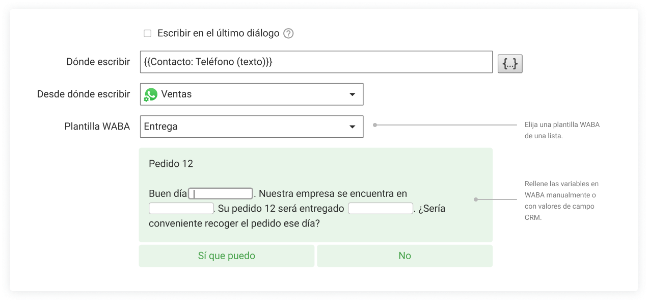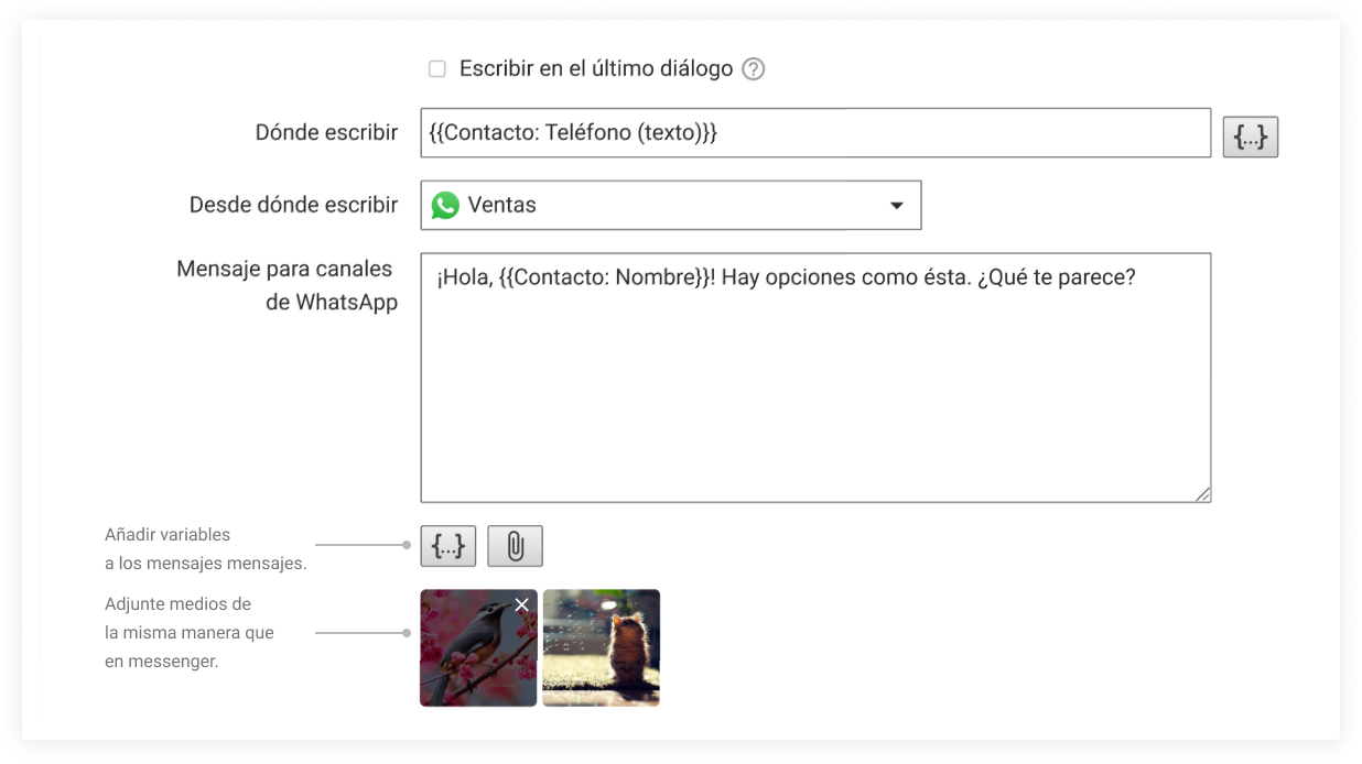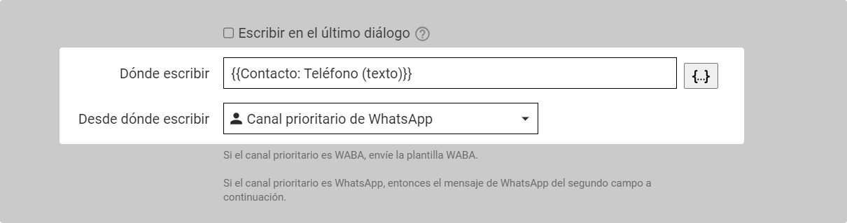Escribir en la última conversación. Si selecciona "Escribir en el último diálogo", el mensaje irá al diálogo que tuvo el último mensaje entrante o saliente, incluido el automático. Irá al mismo número y desde el mismo canal.
