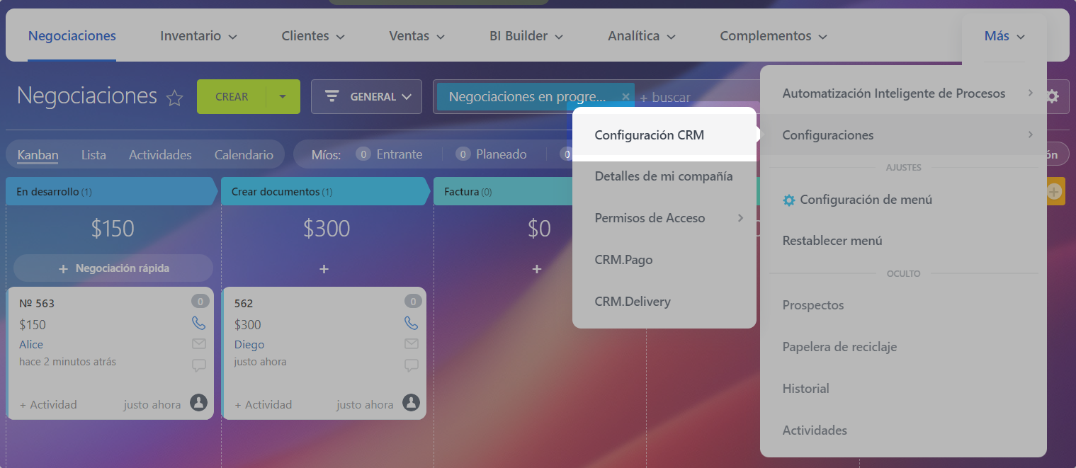 1. Vaya a "CRM" en el panel izquierdo de Bitrix24 → pestaña "Más" en el panel superior → Configuración → "Configuración de CRM".