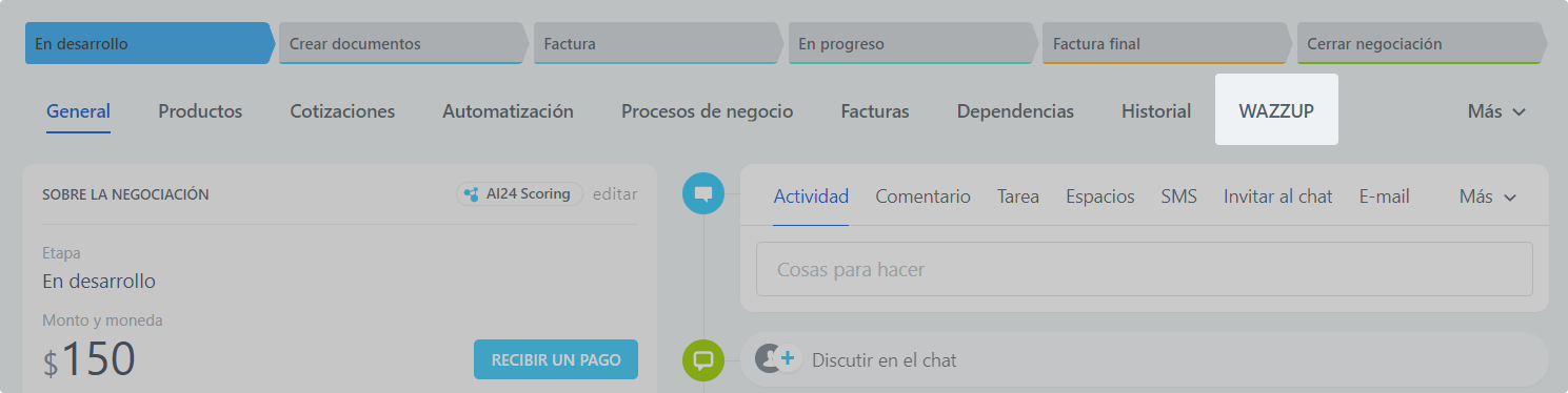 Para abrir un diálogo con un cliente concreto, vaya a la ficha de un lead, contacto, negociacion. El botón para ir al diálogo se encuentra en la barra de menú superior.