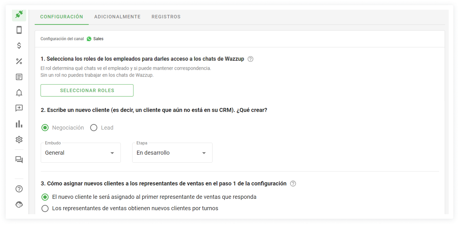 Una vez conectados, los ajustes se muestran en la pestaña "Integración con CRM". Allí configuramos qué chats verán los vendedores y cómo se distribuirán los clientes entre ellos.