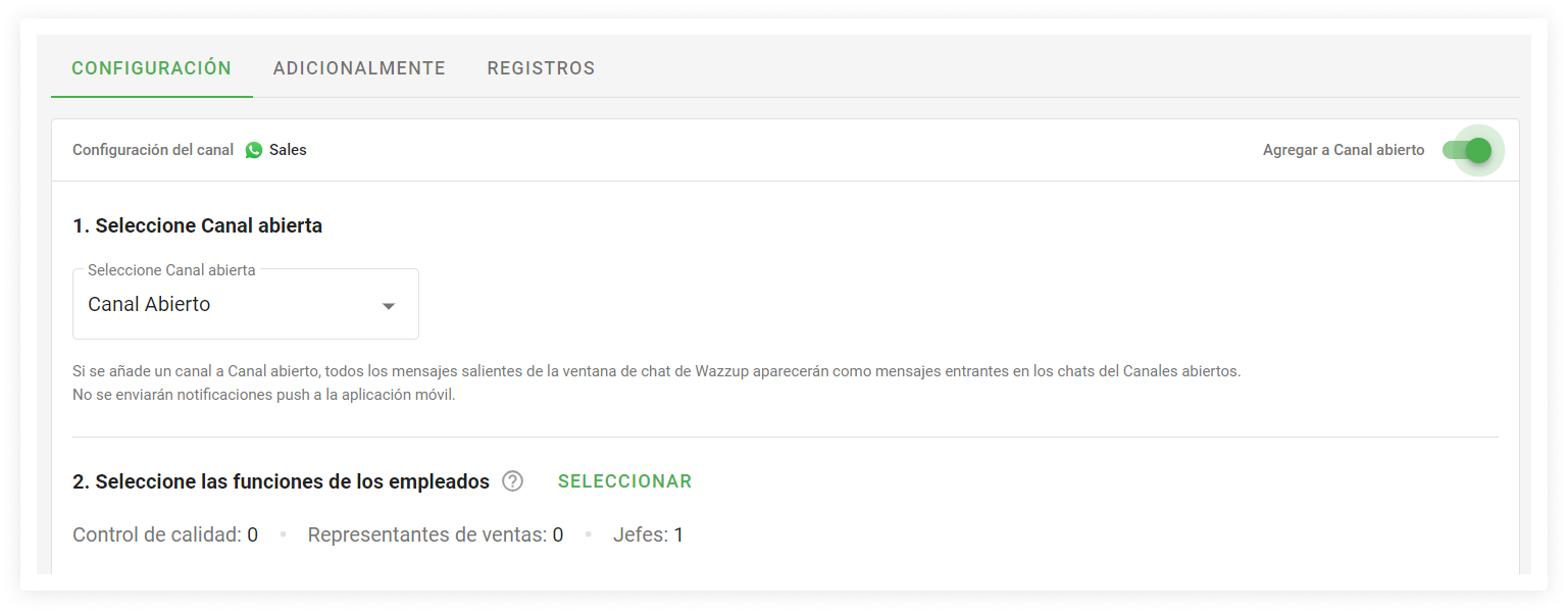 Si sólo un vendedor responde a los mensajes del canal — dele el papel de "Jefes". Incluso si hay un fallo en el CRM o algo falla — él verá los mensajes que llegan al número y será capaz de responder al cliente.