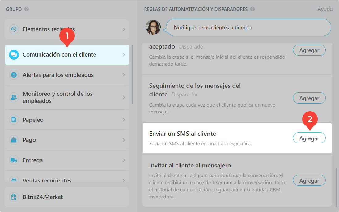 Aunque se llame "Enviar SMS a cliente" el mensaje irá a WhatsApp o Telegram dependiendo de lo que elijas. Así es como se hace en Bitrix ¯\_(ツ)_/¯