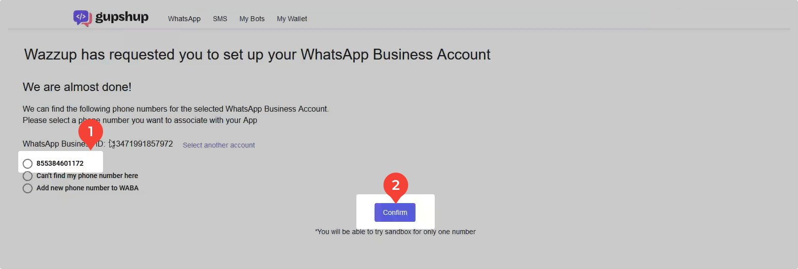 La pestaña se actualizará automáticamente. Aparecerá en la pantalla una lista de números asociados a su cuenta de WhatsApp Business. Seleccione el número al que se está conectando → toque "Confirm" → y nuevamente toque "Confirm".