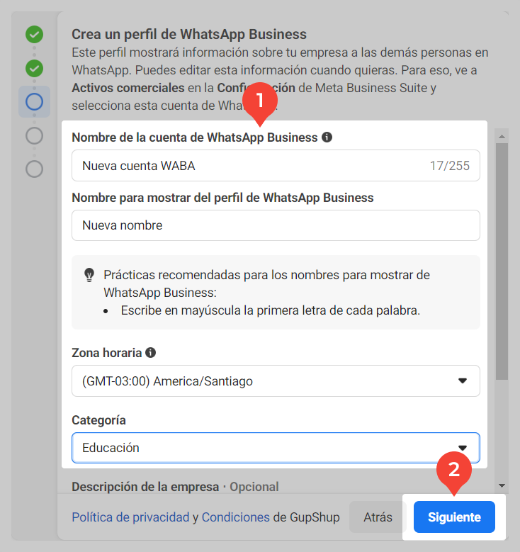 7. Haz clic en "Crear una cuenta de WhatsApp Business" → Siguiente.