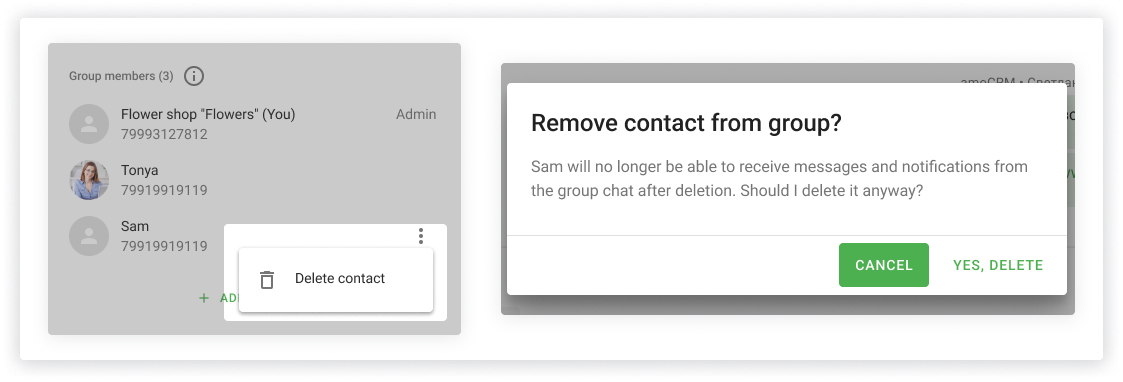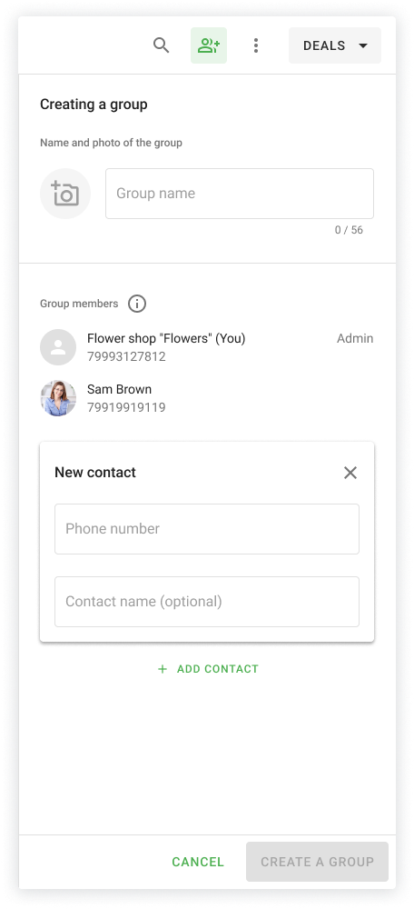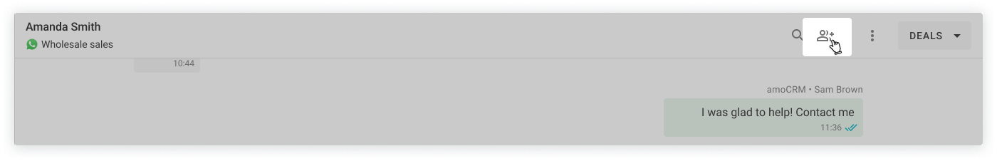 Sin embargo, si se añade un nuevo participante al chat grupal y aún no está en el CRM, no se creará automáticamente. Un contacto y un trato solo aparecerán si el cliente envía un mensaje directo a la empresa.