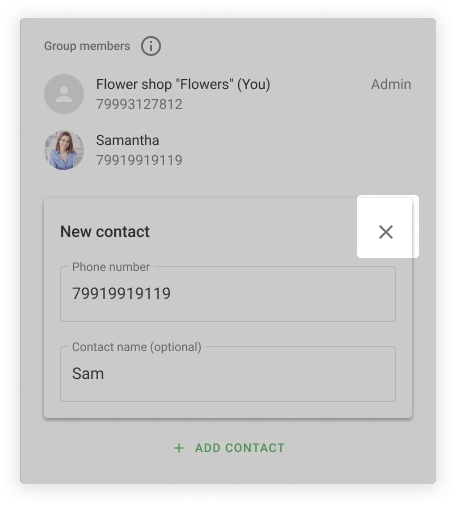 Durante la creación del chat, puede eliminar usuarios haciendo clic en la cruz en la tarjeta "Nuevo contacto".