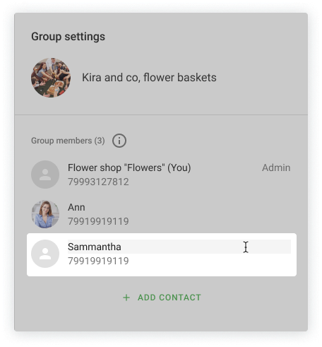 Si te agregaron a un grupo directamente en el mensajero y no a través de Wazzup, no podrás agregar ni eliminar participantes, renombrar el grupo ni cambiar su foto. Pero podrás editar los nombres de los participantes.
