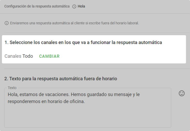 Habilita "Horario no laboral" para responder a los clientes incluso cuando no estés trabajando. Si un cliente escribe y hay silencio en la respuesta, se pone nervioso y corre a hacer críticas o se va en silencio a comprar a otro sitio. Para evitar perder y enfadar a los clientes, configura una respuesta automática.