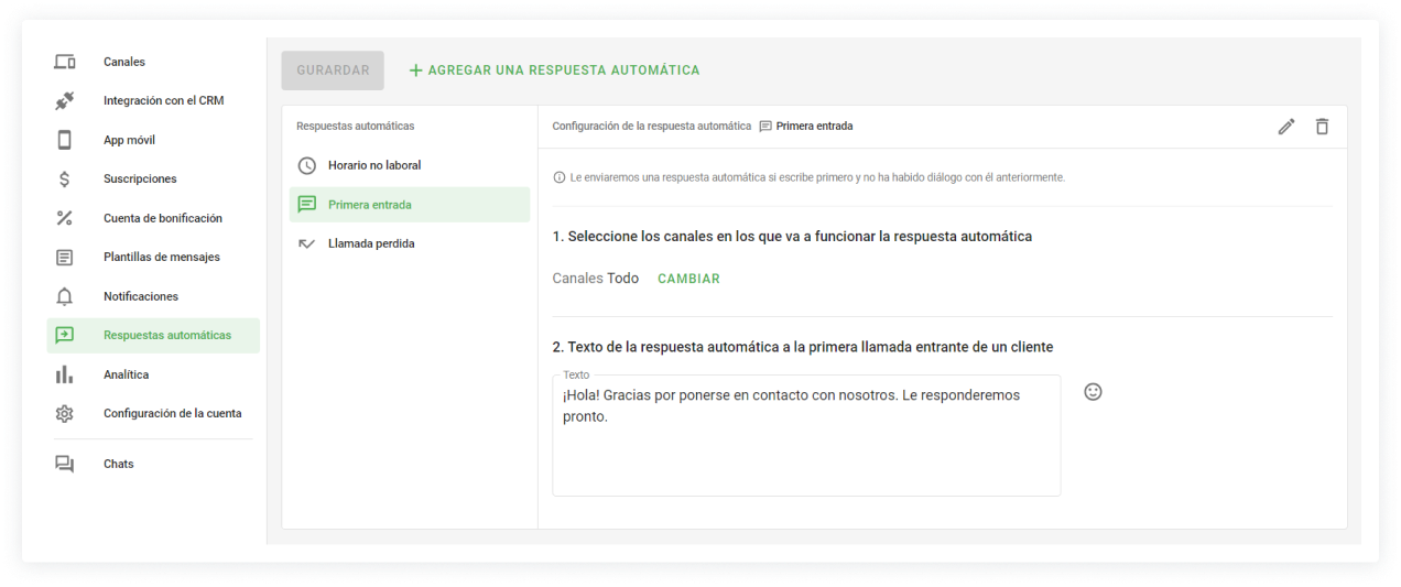 Las respuestas automáticas "Primera entrada" y "Llamada perdida" se conectarán automáticamente en cuanto añadas el primer canal a tu cuenta personal de Wazzup. Además, podrás desactivarlas o editarlas.