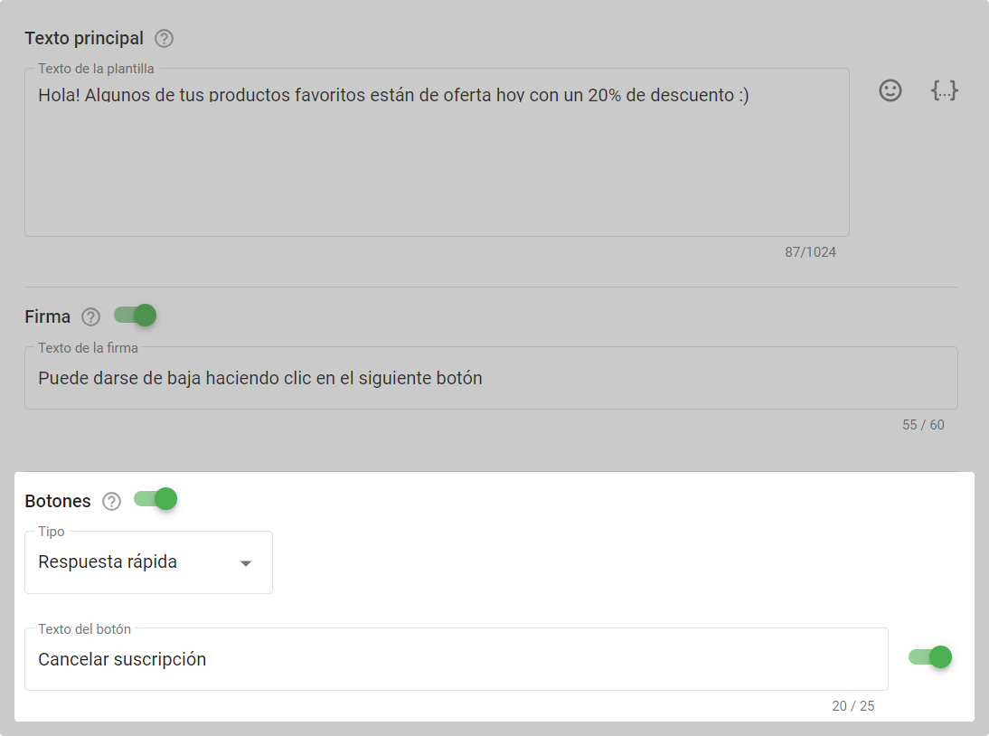Cuando cree una plantilla, añada un botón con el texto "darse de baja". Puedes elegir un texto diferente, pero debe quedar claro que el cliente se da de baja.