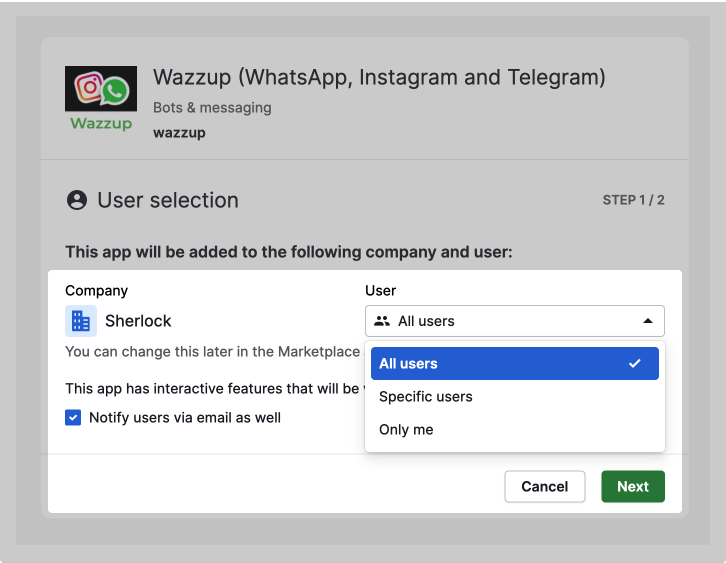 3. En la pestaña del navegador que se abre, selecciona “All users”. Marca “Notify users via email as well” si quieres que tus empleados reciban correos electrónicos sobre la conexión.
