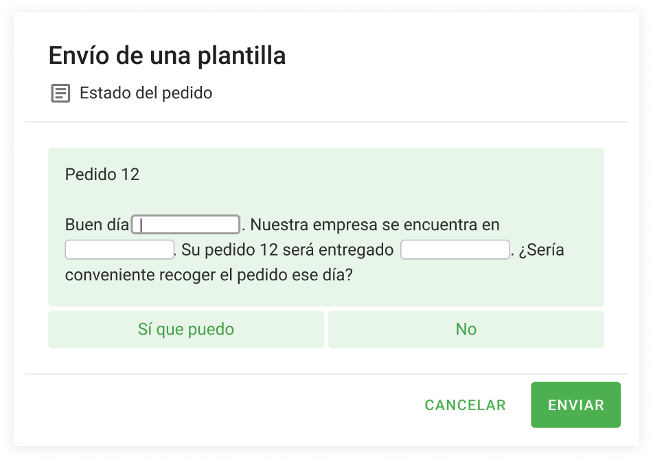 Si la plantilla contiene variables, rellene los campos; de lo contrario, la plantilla no se enviará. Si desea dejar el campo variable vacío, ponga un espacio.