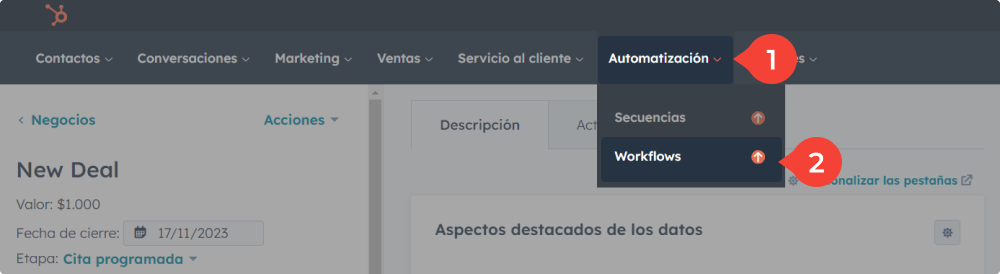 1. Haz clic en el botón "Automatización" de la barra superior de Hubspot → Workflows.