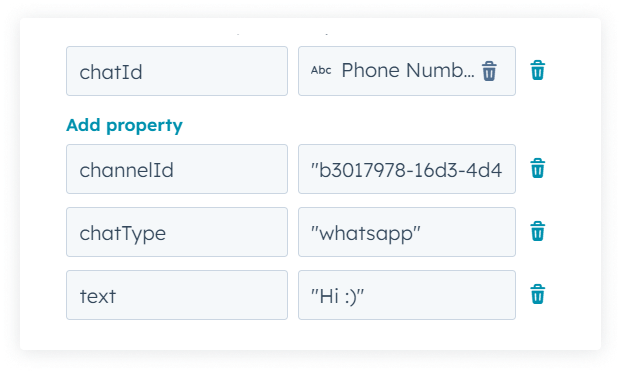 Aquí debe elegir de qué campo de la oferta se tomará el número de teléfono, al que irá el mensaje automático. Haga clic en "Agregar propiedad" y rellene los campos: