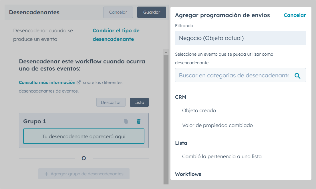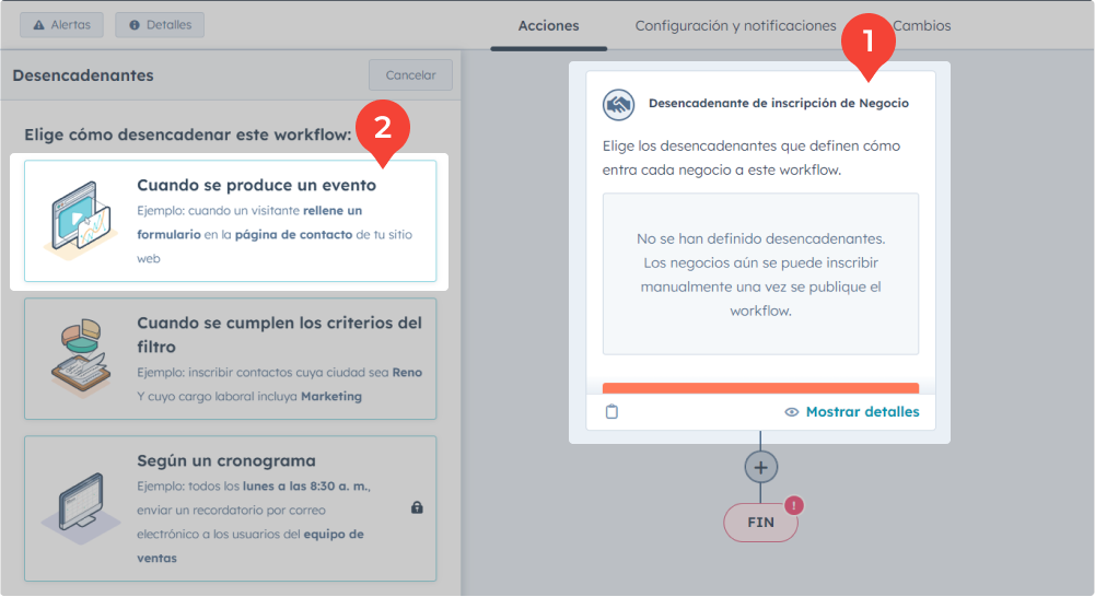4. Se abrirá el workflow. Haga clic en la casilla "Desencadenante de inscripción de Negocio" que verá en el centro del workflow → aparecerán desencadenantes a la izquierda → seleccione "Cuando se produce un evento".