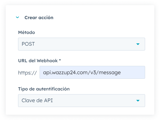 7. Selecciona el método POST. Rellena el campo Webhook URL con este enlace: https://api.wazzup24.com/v3/message