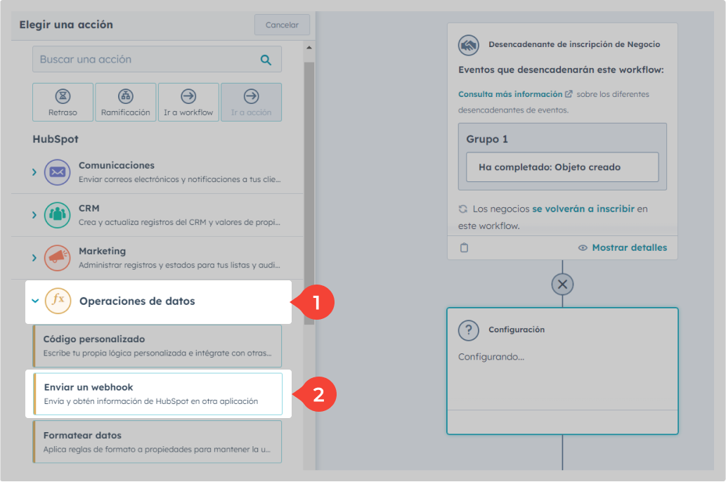 6. Haz clic en "Operaciones de datos" → Enviar un webhook.