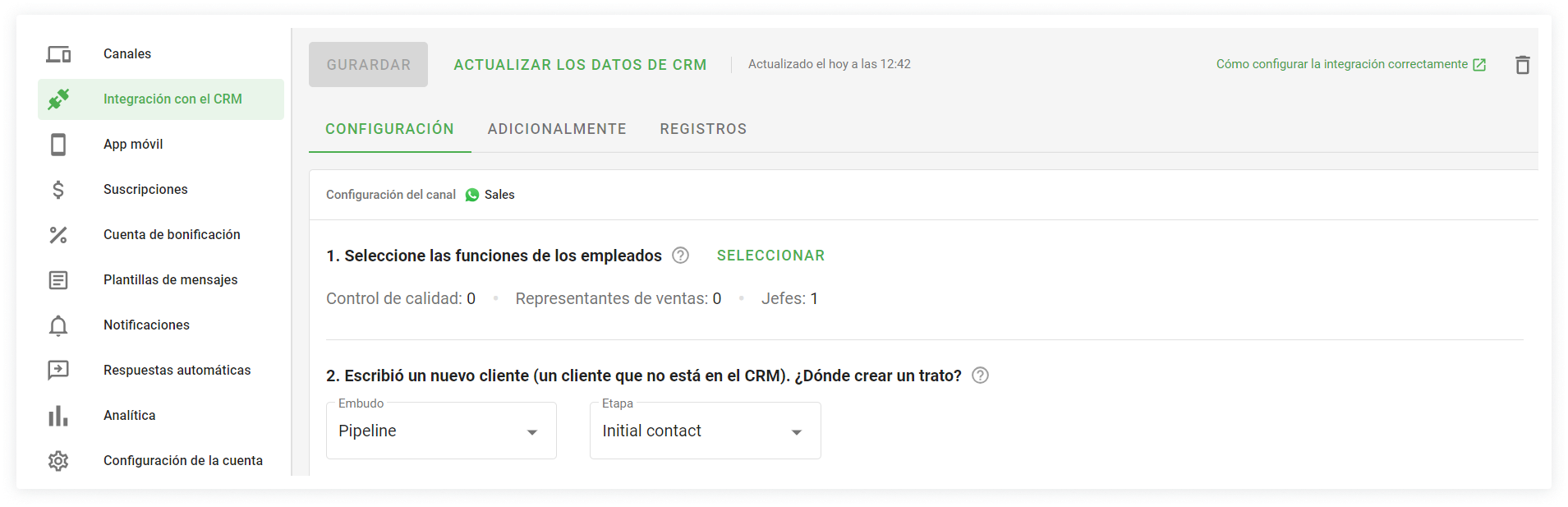 After connecting the integration, the settings are displayed in the "Integración con CRM" tab. There we configure the roles of employees.