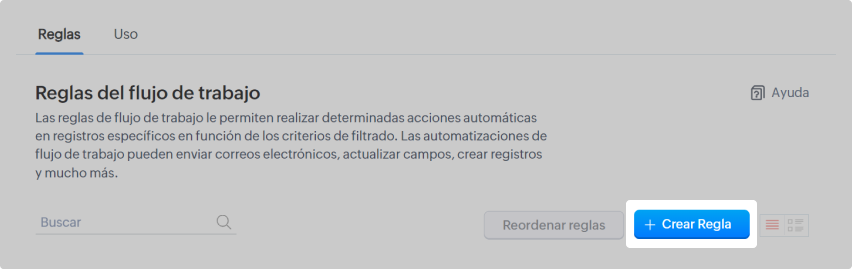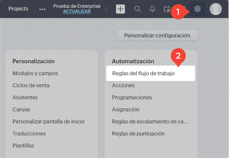 1. Haga clic en el engranaje de la barra de menú superior de Zoho para abrir la configuración → busque "Automatización" → "Reglas de flujo de trabajo".