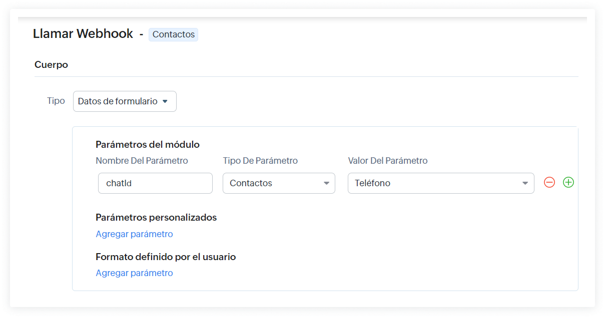 A continuación, en "Parámetros personalizados" añade tres parámetros mediante el botón "Agregar parámetro".