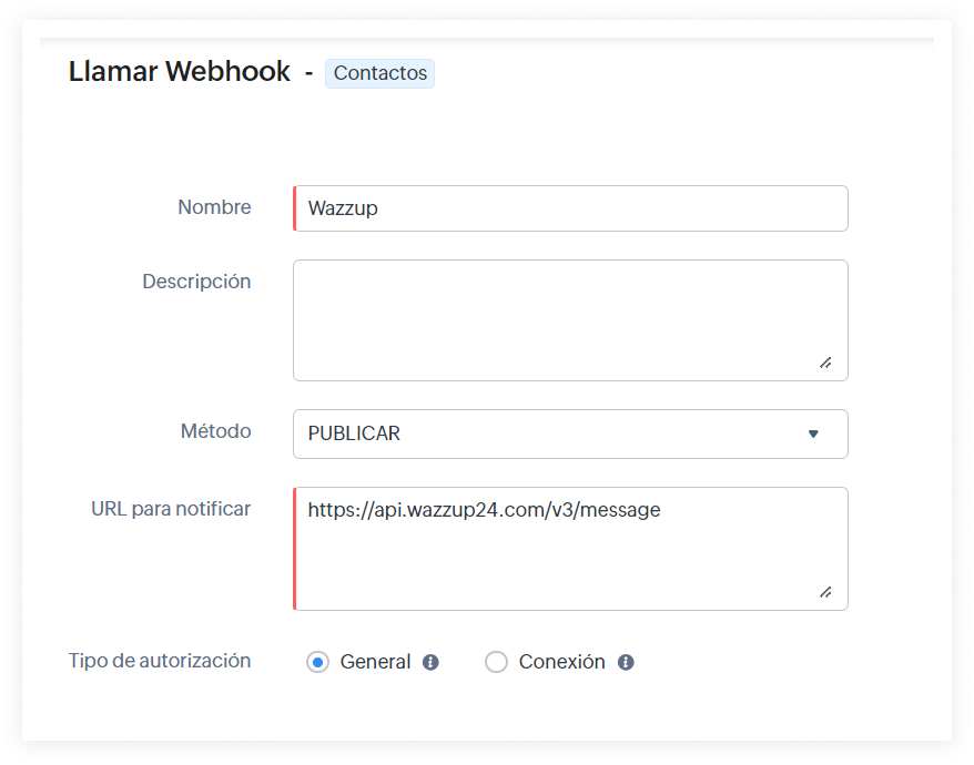 Dentro del webhook, selecciona el método "Publicar". Rellena el campo URL: