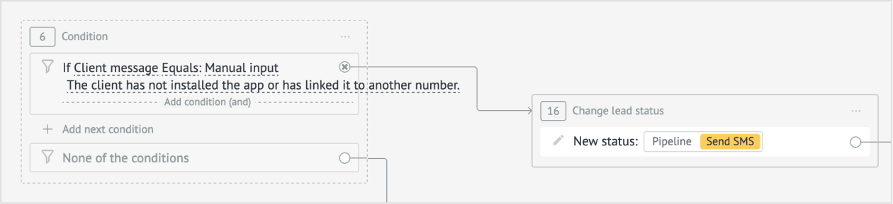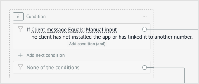 3. Añada la Condición "Si el mensaje del cliente es igual a: Entrada manual" e introduzca el texto "El cliente no ha instalado la aplicación o la ha vinculado a otro número".