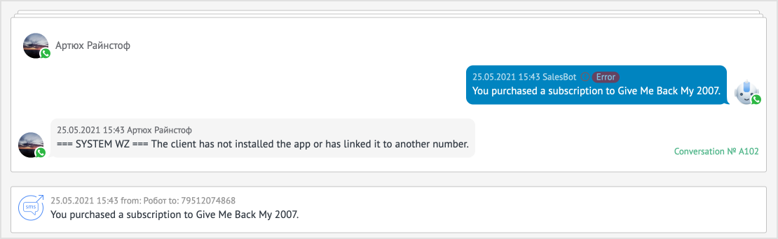 Salesbot se puede configurar para que primero envíe un mensaje al cliente por WhatsApp, y si el número del cliente no tiene WhatsApp, Salesbot enviará un SMS. Aquí tienes un esquema de dicho proceso: