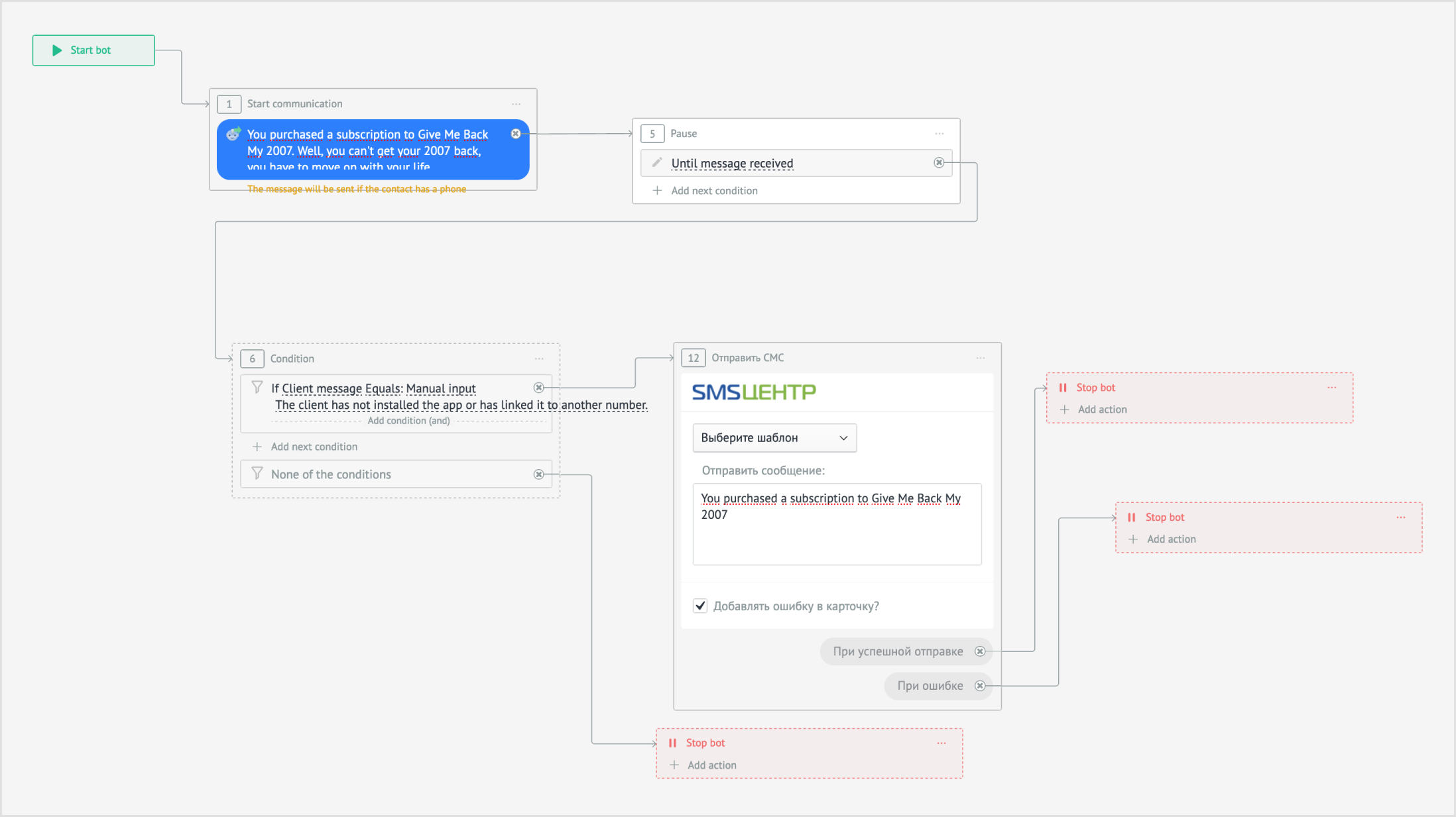 4. Añade un widget de servicio SMS cuando se active una condición e introduce el texto del mensaje. Si la lista de widgets de Salesbot no incluye tu servicio de SMS, lee la siguiente sección.