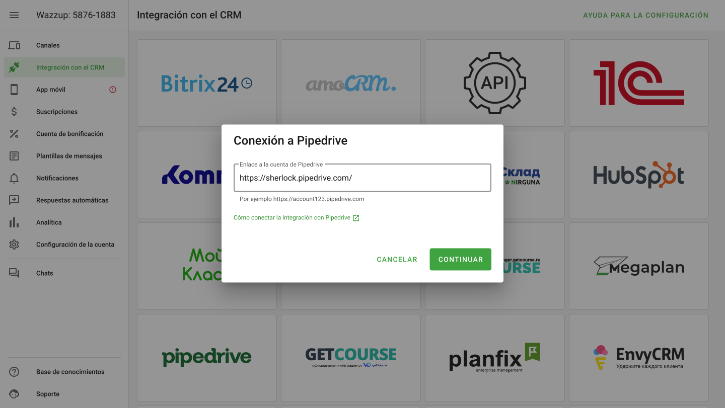 1. Abre la sección «Integración con el CRM» en tu cuenta personal de Wazzup. Selecciona Pipedrive.