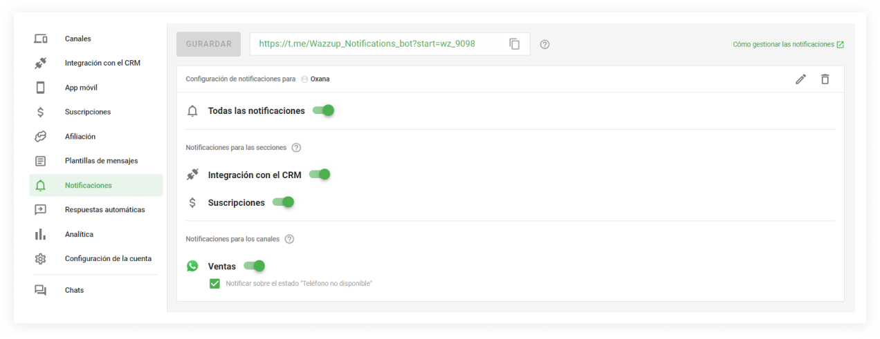 Conecta estas notificaciones a alguien que tenga acceso a tu cuenta personal de Wazzup.