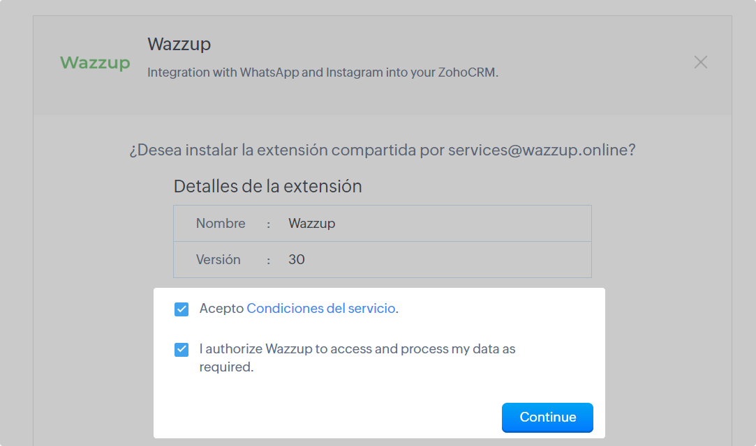 4. Haga clic en el enlace para instalar la extensión Wazzup en Zoho CRM.